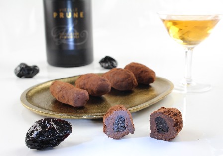 In einem hochwertigen "vieille prune" eingelegte Pflaumen wandern in das Innere der Praline. Dazu bedarf es einer bestimmten Ganache, die sich das gefallen lässt. Ich zeige das gesamte Rezept von der Vorbereitung der Pflaumen bis zum Rollen in Kakao.
