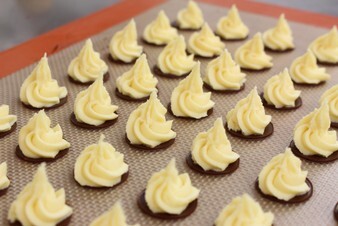Aufgespritzte Trüffel auf selbst hergestellten Schokoplättchen