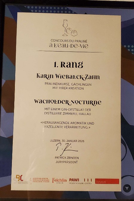 Am 21. Februar 2026 gewann Karin Wiebalck-Zahn den 1. Preis beim Schweizerischen Ginpralinenwettbewerb, organisiert vom Schweizerischen Bäcker- und Confiseure-Verband. Somit schuf Karin Wiebalck-Zahn das beste Gin-Praliné der Schweiz. Nach der Preisverleihung gabe es viele Zeitungsberichte und ein Interview im Schaffhauser Fernsehen.